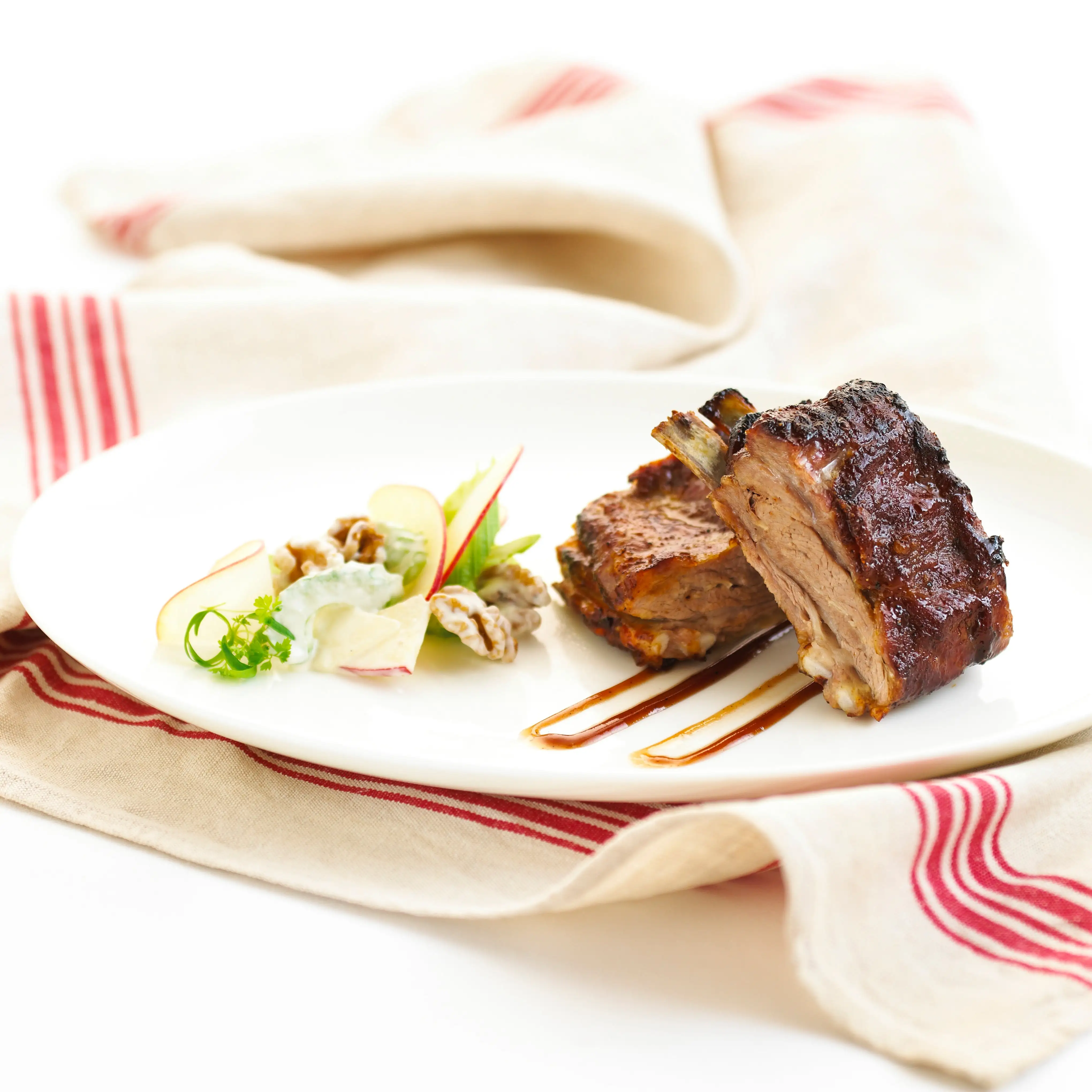 - Cut the rack into individual ribs and place into a baking dish. Season with a very light sprinkle of salt.